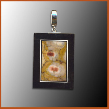 This pendant features a center of Birdseye Rhyolite in an abstract landscape pattern, surrounded by howlite and black onyx. The bail is sterling silver and top-drilled into the pendant.