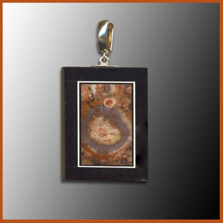 This pendant features a center of Birdseye Rhyolite in an abstract landscape pattern, surrounded by howlite and black onyx. The bail is sterling silver and top-drilled into the pendant.