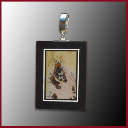 This pendant features a center of Nature's Paintbrush in a scenic landscape surrounded by howlite and black onyx. The bail is sterling silver and top-drilled into the pendant.