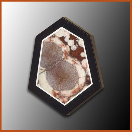 features a center of birdseye rhyolite that creates an abstract landscape, and is surrounded by howlite and black onyx in an equiangular hexagon.