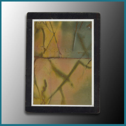INT173db Intarsia Drilled Bead features a center of Cherry Creek Jasper that creates an abstract landscape, and is surrounded by howlite and black onyx.