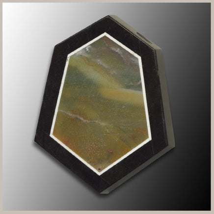 INT178db Intarsia Drilled Bead features a center of blue quartz that creates an abstract landscape, and is surrounded by howlite and black onyx in an equiangular hexagon.