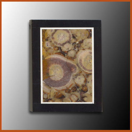 INT183db Intarsia Drilled Bead features maroon, tan, orange, green, and yellow Birdseye Rhyolite framed by Howlite and Black Onyx. A 2mm hole is drilled on the top side of the bead.