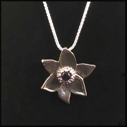 May Flower Necklace features a silver May Flower with either a rose quartz or amethyst center on an 18" Italian silver chain. These were made exclusively for The Gem Shop by a highly skilled, professional jeweler. The necklace comes in a matte black box with a black velvet pillow.