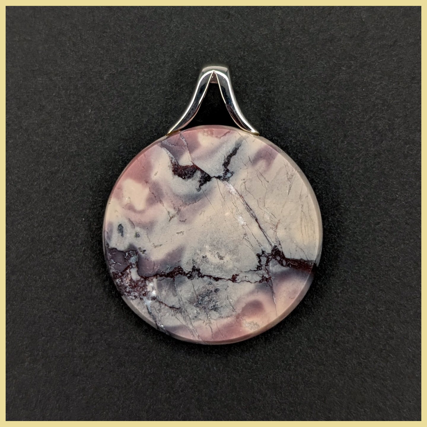 This pendant contains Porcelain Jasper showing varying shades of pink and purple over a gray and off-white background. Topped with a 925 sterling silver bail which allows the full beauty of the stone to show, with a wide opening to allow for most size chains/clasps feed through.