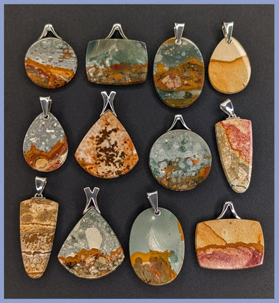 This lot of pendants contains twelve pieces made from Rocky Butte Picture Jasper, displaying muted blue-green, golden browns, tan, and pink to red jasper with varying patterning. Each topped with a 925 sterling silver bail which allows the full beauty of the stone to show, with a wide opening to allow for most size chains/clasps feed through.