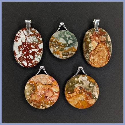 This lot of pendants contains five pieces made from Rocky Butte Picture Jasper, displaying blue-greens, tans to golden browns, and accents in pink or red, in overall speckled patterning. Each topped with a 925 sterling silver bail which allows the full beauty of the stone to show, with a wide opening to allow for most size chains/clasps feed through.