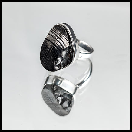 This statement ring features raw elite shungite, set in high quality silver that will not tarnish. You will receive the exact ring pictured.