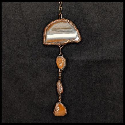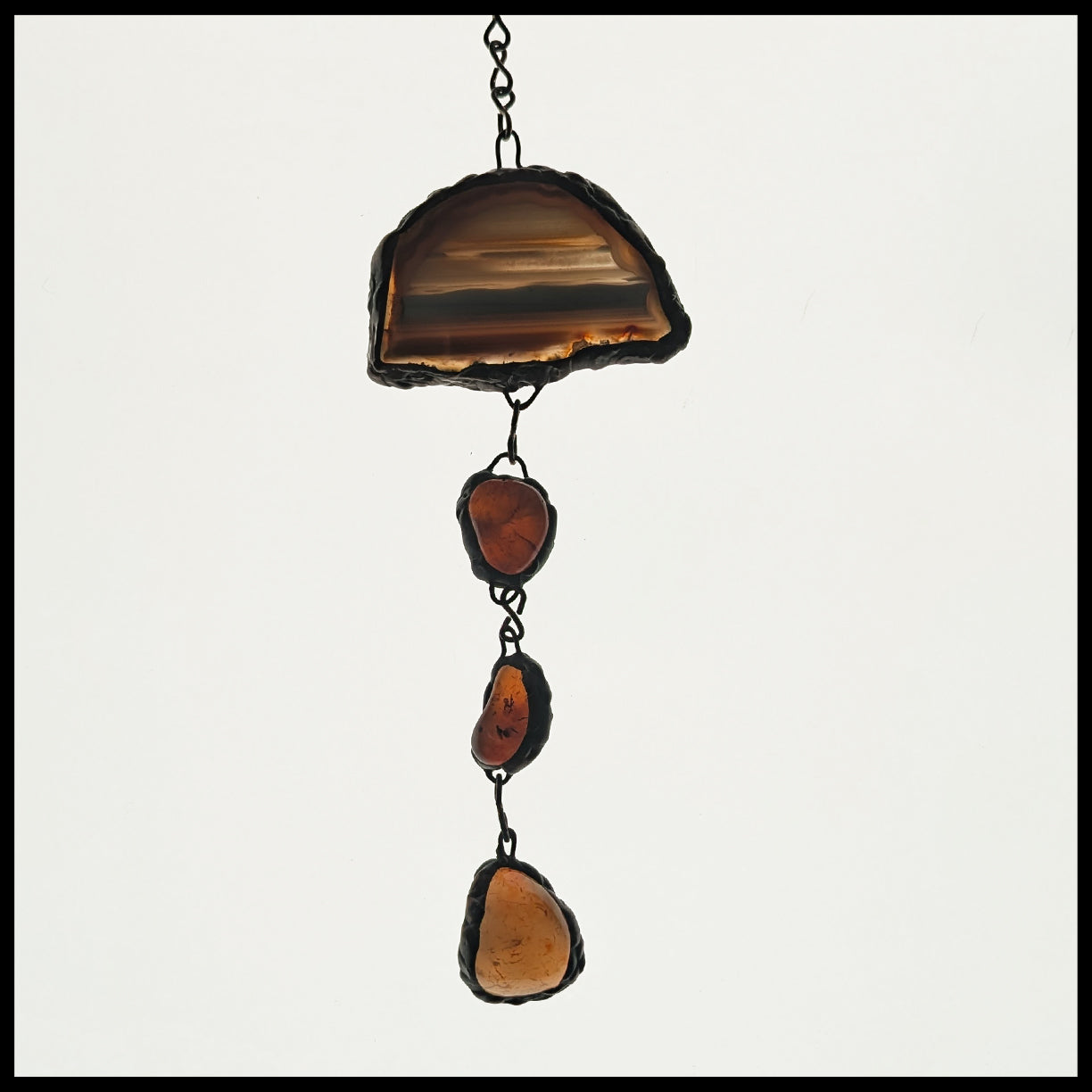 This gemstone creation can be used is a beautiful hanging suncatcher, created by artist Jim Pape from various gemstones and chalcedonies wrapped with copper and soldered, with an antique patina. It has a sturdy chain with a loop on the end created from the chain links. Not intended for outdoor use.