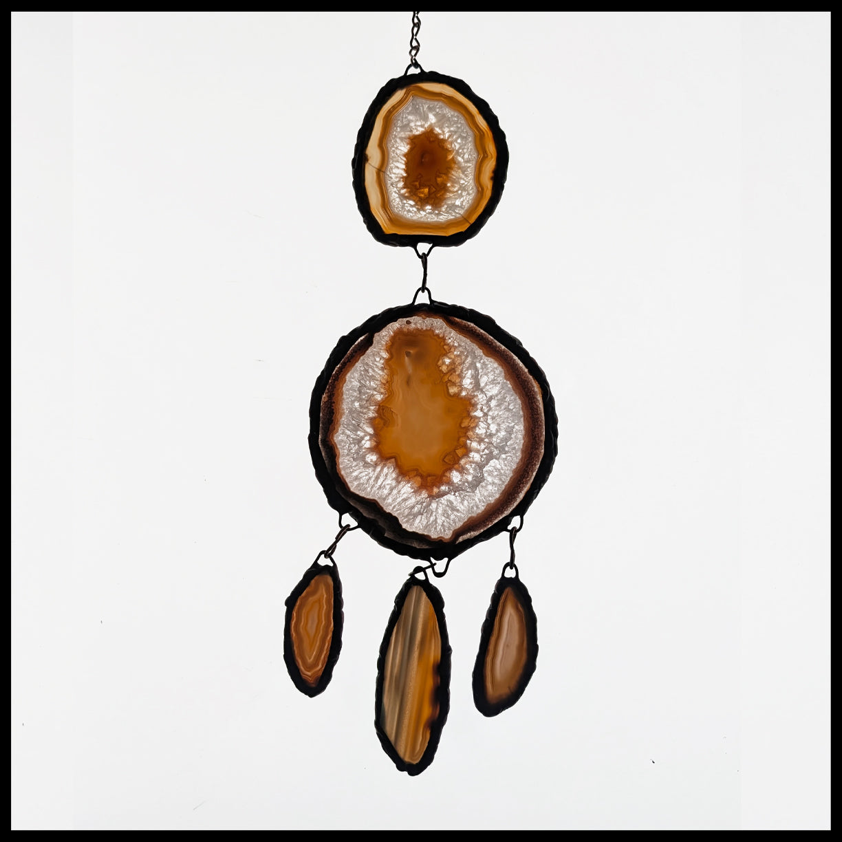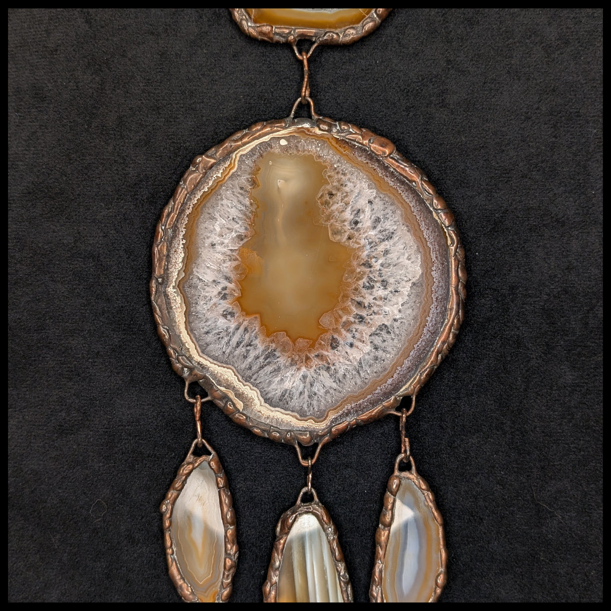 This gemstone creation can be used is a beautiful hanging suncatcher, created by artist Jim Pape from agates wrapped with copper and soldered, with an antique patina. It has a sturdy chain with a loop on the end created from the chain links. Not intended for outdoor use.