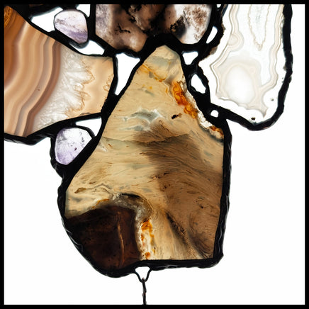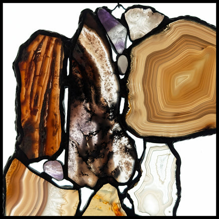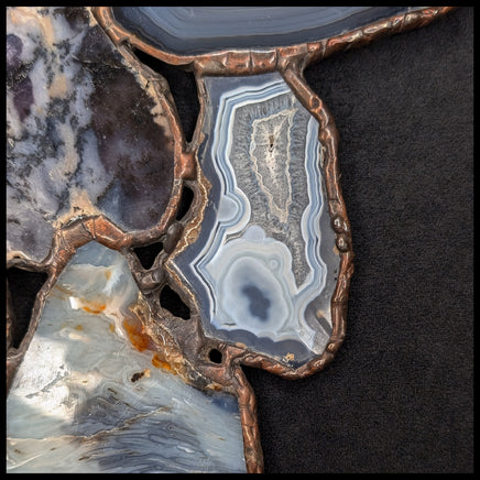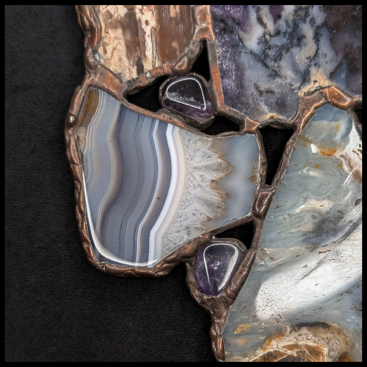This large piece combines agate slabs from Oregon, Arizona, Wyoming, and Brazil, showing all sorts of plumes, banding, and dendritic formations. Between the slabs are connecting points that include tumbled Amethyst, botryoidal chalcedony, and Apache Tears.