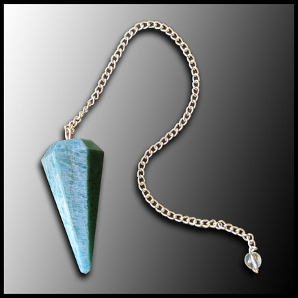 Pendulum carved from Amazonite in a light greenish blue with white patterning. Set on a chain with a transparent bead.