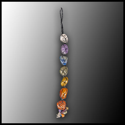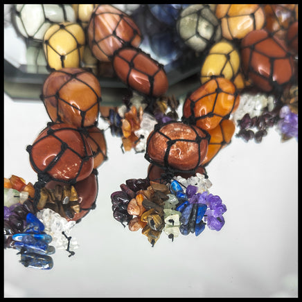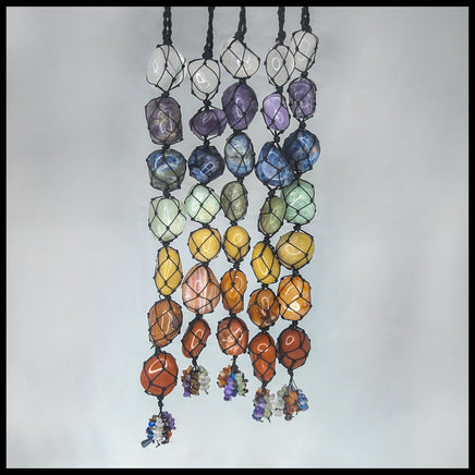 The tumbled stones correspond to the seven chakras, in Clear Quartz (Crown Chakra), Amethyst (Third Eye Chakra), Sodalite (Throat Chakra), Green Aventurine (Heart Chakra), Yellow Aventurine (Solar Plexus Chakra), Carnelian (Sacral Chakra), and Red Jasper (Root Chakra). The fringe of small tumbled gemstone chips is in the same colors, but the stones could also include Garnet, Tigereye, or Lapis Lazuli.