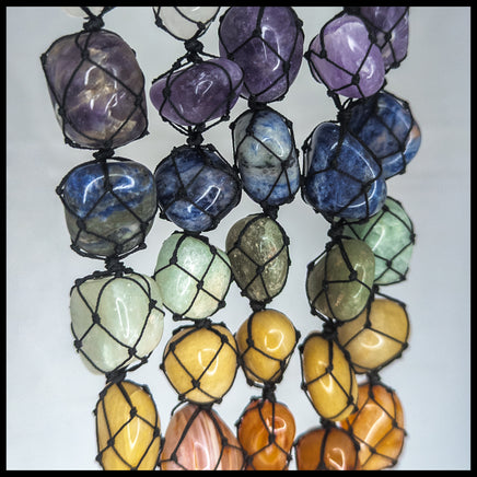 This hanging décor item features seven tumbled stones connected together with black thread in a macramé style. The hoop on top has multiple layers of twisted thread for extra durability, and the bottom features decorative gemstone "fringe" in seven colors as well.
