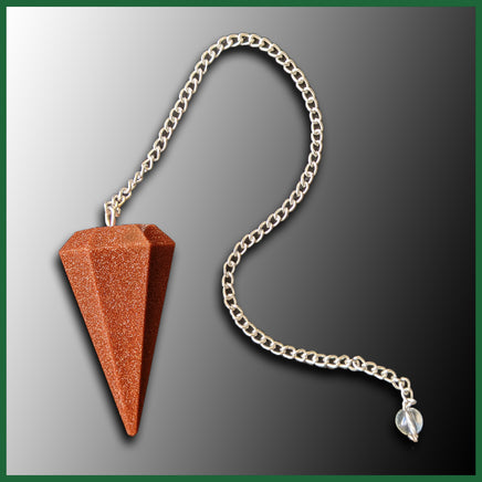 Pendulum carved from goldstone in a sparkly dark gold color. Set on a chain with a transparent bead.