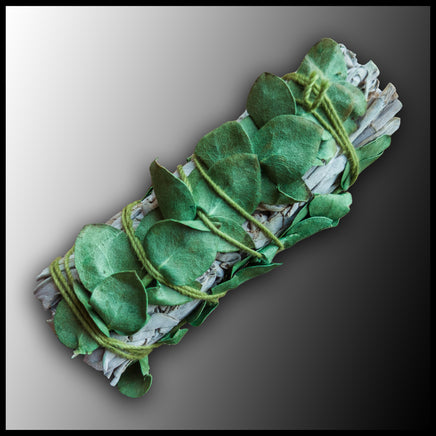 One bundle of white sage from California bundled together with green eucalyptus leaves with a matching green thread. Eucalyptus is commonly used in aromatherapy for exhaustion and energy restoration.