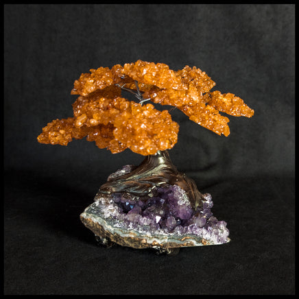 Gemstone Trees have been present in many cultures, and are popular in home décor concepts and practices like Feng Shui and Vastu Shastra. This Gemstone Tree is a size 4 and features leaves made of Citrine chips and an Amethyst crystal base. The leaves are secured on bendable wire, for your creative preference in positioning.