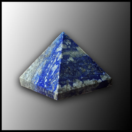 Small pyramid carved from lapis lazuli, in bright blue with white/grey and metallic pyrite patterning.