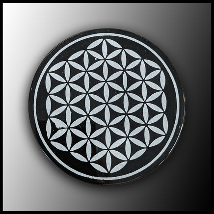 Black polished obsidian plate with the flower of life sacred geometry pattern.