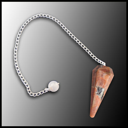 Pendulum carved from a peachy orange colored feldspar (moonstone). Occasional silvery mica inclusions are present.