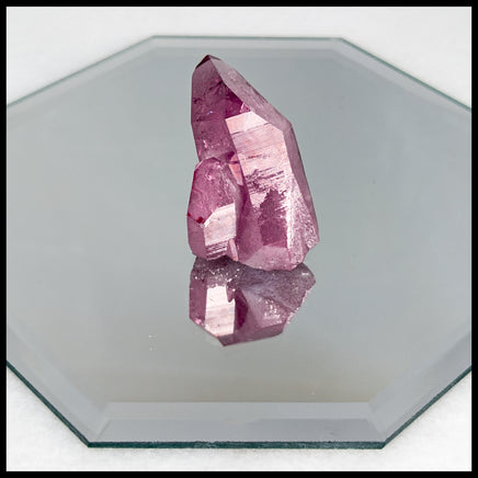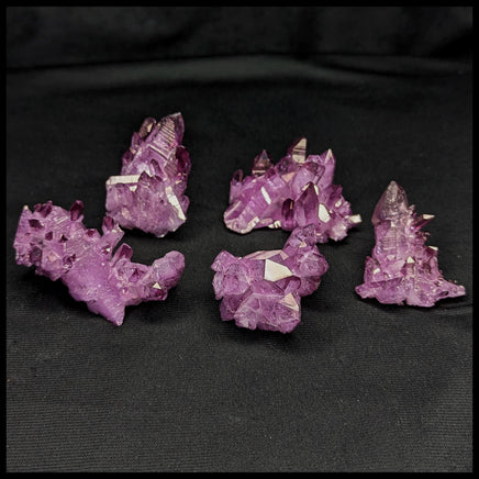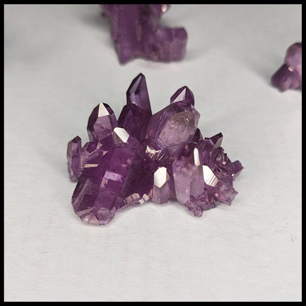 From Arkansas, "Purple Mist Quartz" is an aura quartz that has been changed to a beautiful warm purple color with occasional iridescent flashes. Processes like vapor deposition or electroplating are used to combine natural quartz with other natural metals to permanently bond their chemical structures. The purple coloring is permanent, unlike dyes or some heat treatments. Each cluster is different from one another, and can be one or more larger crystals, or a plate-like cluster of many small crystals.