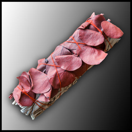 One bundle of white sage from California bundled together with red eucalyptus leaves with a matching red thread. Eucalyptus is commonly used in aromatherapy for exhaustion and energy restoration.