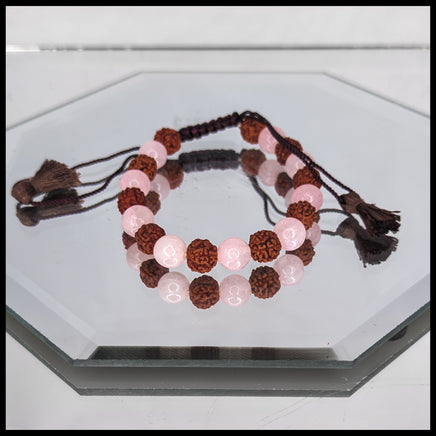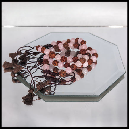 This round bead bracelet has a knotted sliding closure, making it adjustable, durable, and easy to put on. The string and tassels are a dark reddish brown, and the beads alternate between light pink rose quartz and reddish brown rudraksha stones.