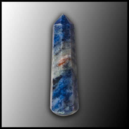Small massage wand carved from sodalite, in dark blue and gray with occasional spots of orange. Has one terminated end and one smooth rounded end.