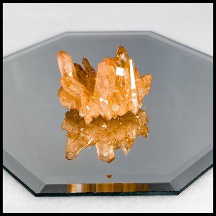 From Arkansas, "Sunrise Mist Quartz" is an aura quartz that has been changed to a beautiful golden color with occasional iridescent flashes. Processes like vapor deposition or electroplating are used to combine natural quartz with other natural metals to permanently bond their chemical structures. The color is permanent, unlike dyes or some heat treatments. Each cluster is different from one another, and can be one or more larger crystals, or a plate-like cluster of many small crystals.