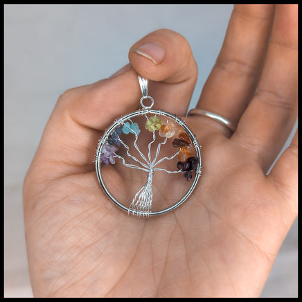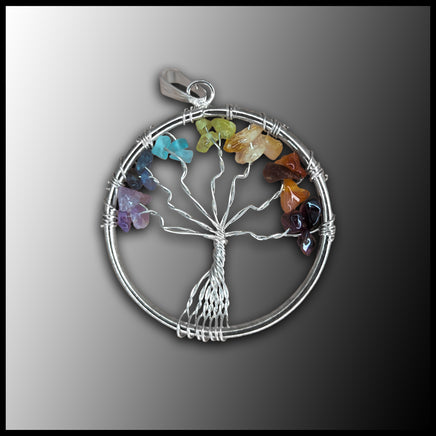 This pendant uses wire-wrapping to create the traditional Tree of Life within a circle. The unifying circle and tree of life symbol is used across many religions, mythologies, and cultures. On the silver wire branches are strung small tumbled stone chips in a rainbow of chakra colors.