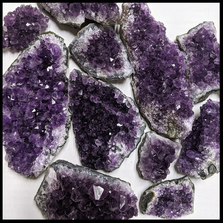 Small Amethyst Plates from Uruguay. These flats are "B" grade Amethyst with coloring ranging from light to deep purple. The shapes and sizes vary, and pieces range from about 0.10 - 1 pound. Its chemical formula is SiO2 and owes its purple coloration to irradiation of ferrous iron: Fe3+.