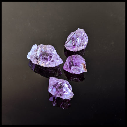 Individual crystals from our amethyst geodes from Sonora, Mexico that have naturally broken from matrix in transit. Small double terminated amethyst crystals, generally 1cm in length, and sometimes with spots of chalky matrix on the outside. The localized amethyst color is often distinguishable in these crystals. Its chemical formula is SiO2 and owes its purple coloration to irradiation of ferrous iron: Fe3+.