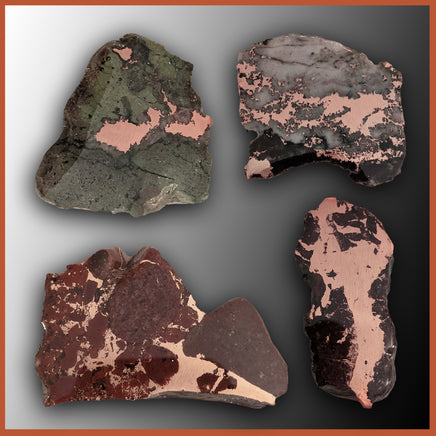 Native Michigan copper slabs feature copper-rich ore with quartz, basalt, epidote, and calcite coated with a thin coat of epoxy to prevent oxidation. The chemical symbol for copper is Cu.