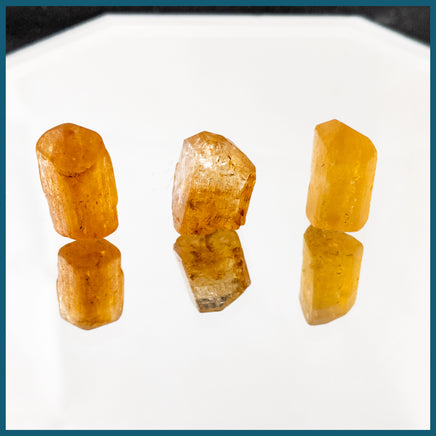 Set of three natural Imperial Topaz crystals in golden yellow and orange colors.