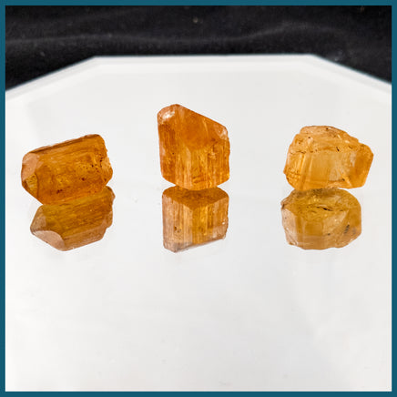 Set of three natural Imperial Topaz crystals in golden yellow and orange colors.