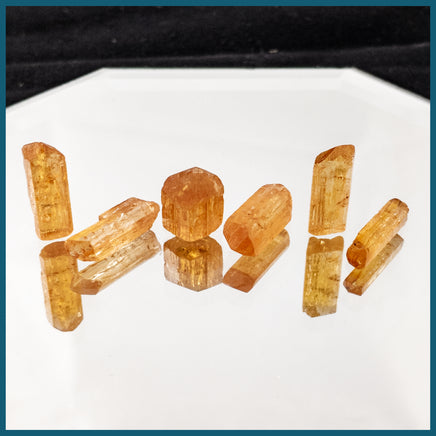 Set of six natural Imperial Topaz crystals in golden yellow to orange colors.
