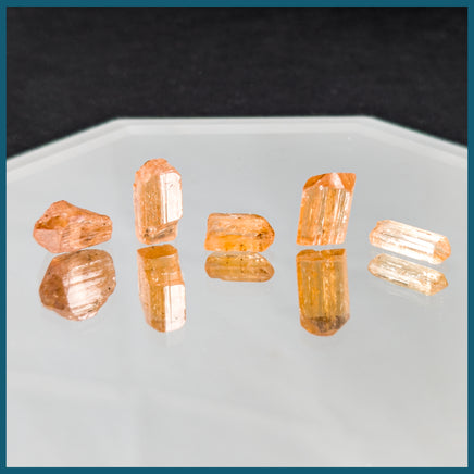 Set of 5 Golden Imperial Topaz crystals in translucent golden yellow and orange.