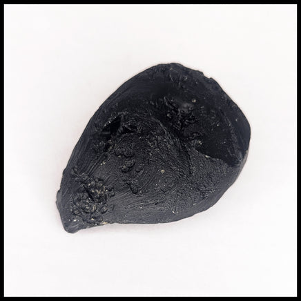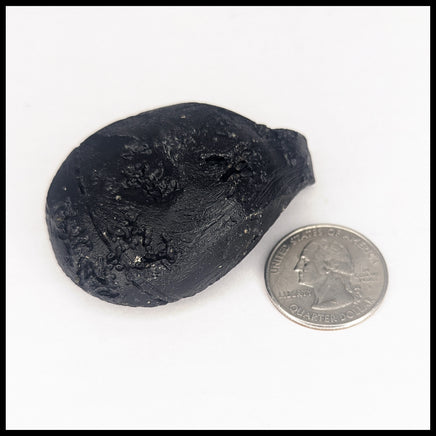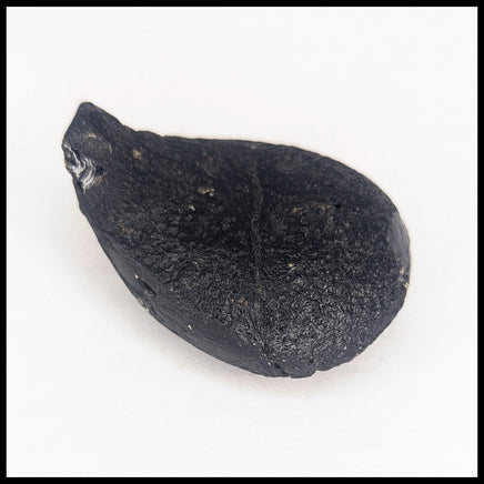 Indochinites are tektites from the massive Australasian strewn field, which includes all varieties of tektites found in China, the Indochinese Peninsula, Philippines, Indonesia, Australia, and any Micronesian islands. These tektites are mostly black or very dark green, and can be in a variety of typical splash-form tektites, like teardrops, spheres, ellipsoids, dumbbells, and even buttons. This piece is a flattened teardrop with classic texture and pitting.