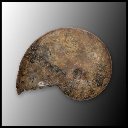 This ammonite specimen comes from South Dakota in the Cretaceous period when the area was submerged by the Western Interior Seaway millions of years ago. They are typically preserved in hard concretions that must be carefully removed. The surface of this fossil shows complex suture patterns in overall shades of warm brown, with little spots of red or purple iridescence. It has a smooth outer surface with a sharp spine.