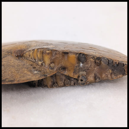 Ammonites are prehistoric nautilus related to the modern day nautilus, squid, and octopus family. These squid-like creatures lived in the sea between 65 - 415 millions years ago. Ammonites are called cephalopods because their heads and tentacles protruded out of the same opening; they grew by building larger chambers on their shells. Some species have been found at almost 6 feet in diameter, but they may have reached up to 9 feet!
