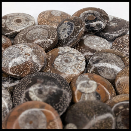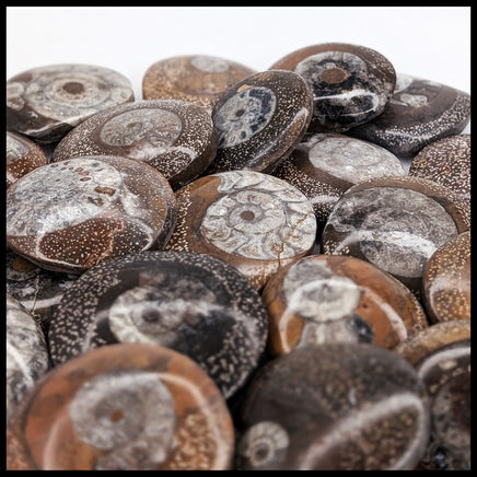 Found in Morocco, believed to be from the Devonian period approximately 350 million years old. These ammonite fossils are found in limestone host, and shaped into little discs that are commonly called ammonite buttons. They show a mix of the light gray fossil in a speckled host in medium to dark browns. If you have a preference on the exact color, please indicate in your order notes.