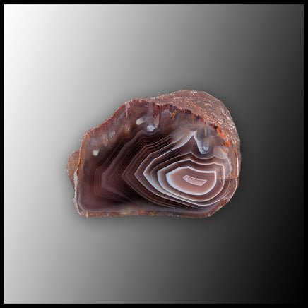 This Botswana Agate polished specimen features dark reddish brown and dark gray agate with white banding, little sticklike inclusions, and spots of parallax or "shadow" effect.
