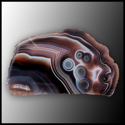 This Botswana Agate polished slab features dark blue-gray and dark reddish-brown agate with white banding, tube patterning, spots of parallax or "shadow" effect, and a tiny little quartz center.