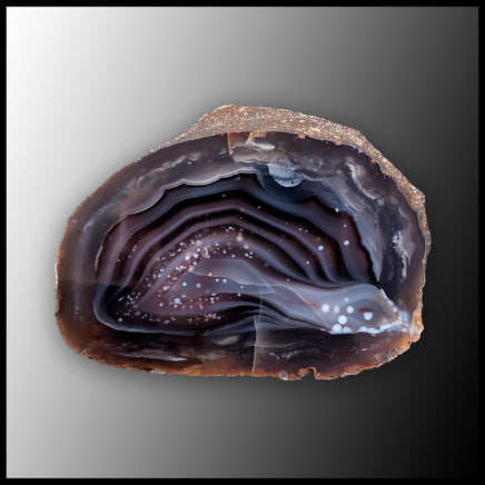 This Botswana Agate polished specimen features translucent gray agate with a flow channel and concentric banding, with tints of blue to purple and little white speckling.