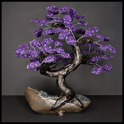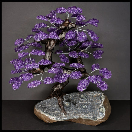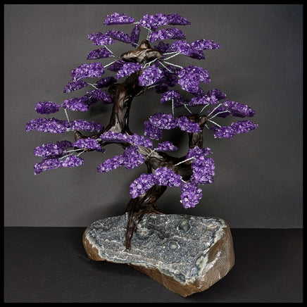 Gemstone Trees have been present in many cultures, and are popular in home décor concepts and practices like Feng Shui and Vastu Shastra. This Gemstone Tree is a size 7, the largest size available. It features leaves made of amethyst chips secured on bendable wire for movable positioning. Its base is a thick section of amethyst crystals with a polished edge.