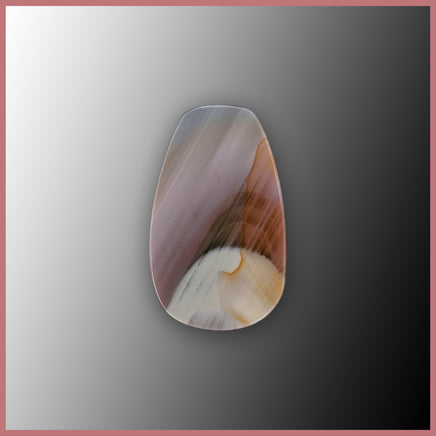 This Imperial Jasper cabochon shows parallel bands and part of some egg patterning, in muted shades of mauve and brown with hints of blue and red.