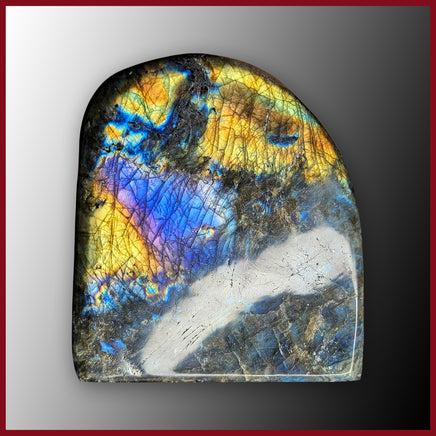 This large freeform Labradorite is from Madagascar, is fully polished, and has a flat base. The face shows strong labradorescence in orange, yellow, green, and blue, and the back includes a large section of strong purple.