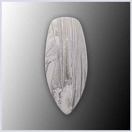 This Lattice Lace Agate Polished cabochon shows overlapping white lines and banding with lacey speckling and open pockets of druzy.
