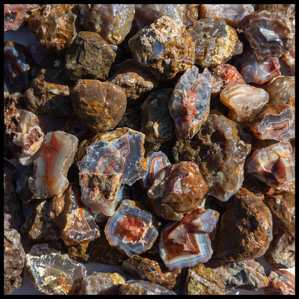 From the current Alimajo claim in Malawi, Africa. Commonly displays red and orange banding. Great for "candy dish" specimens. Super fun to cut on a trim saw! Primarily all whole nodules, but a rare broken nodule is possible.