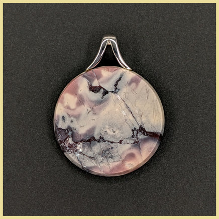 This pendant contains Porcelain Jasper showing varying shades of pink and purple over a gray and off-white background. Topped with a 925 sterling silver bail which allows the full beauty of the stone to show, with a wide opening to allow for most size chains/clasps feed through.